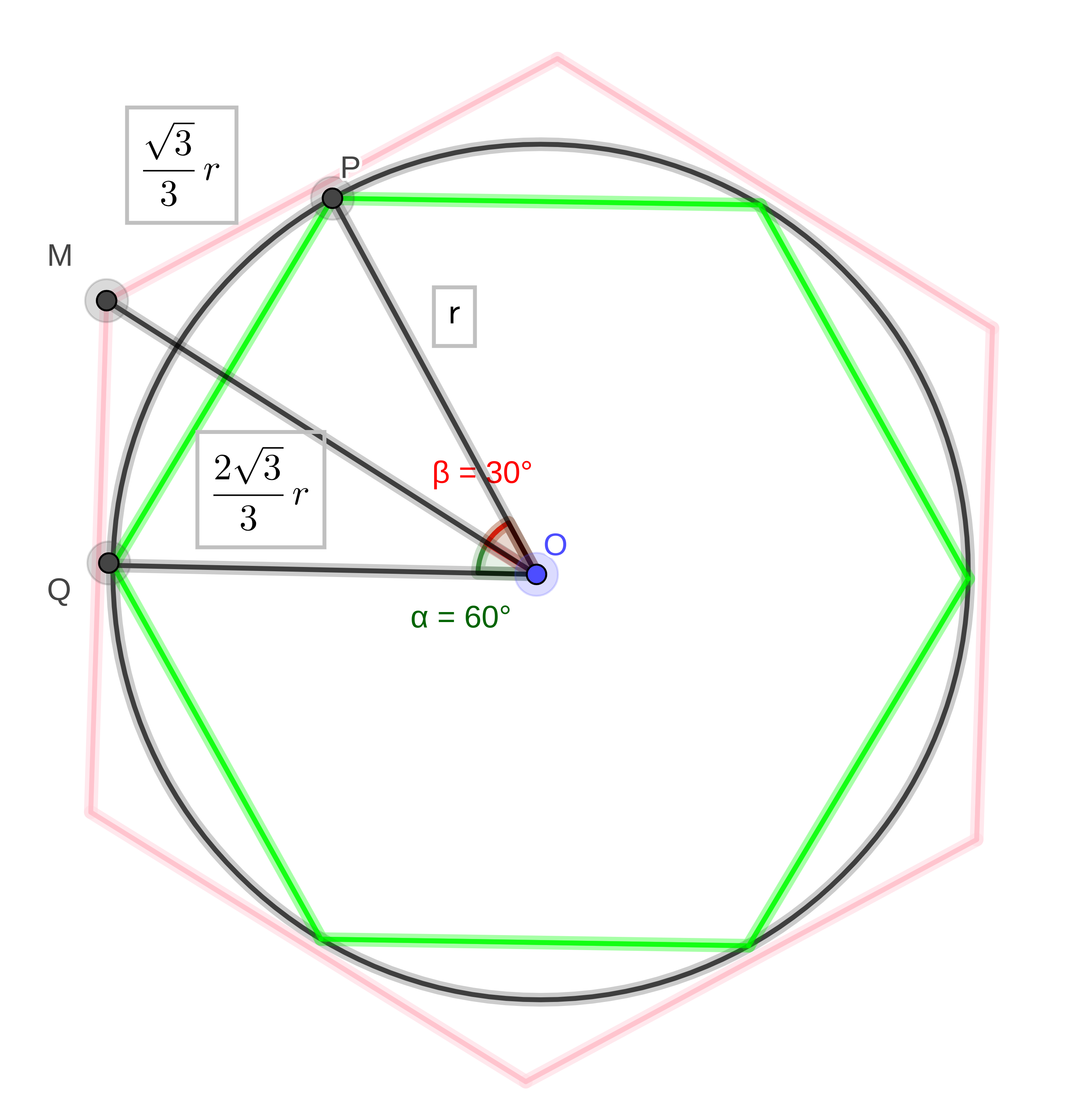 - $6r=C^{<}<2\pi r<C^{>}=4\sqrt{3}r \Longrightarrow 3<\pi<2\sqrt{3}\approx 3.464$